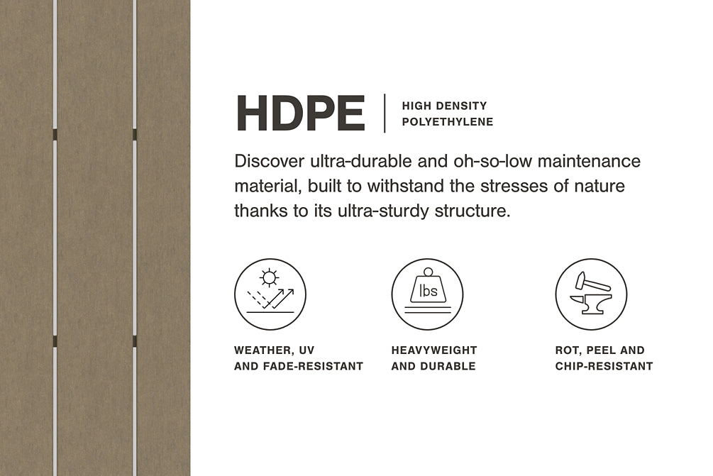 Details | Made of MEGA-TUFF® HDPE (a high-density polyethylene), which gives the wood look you love and the weather resistance you crave, Stainless steel hardware, Designed to withstand the harsh elements of the outdoors, Slatted design, Assembly required | |